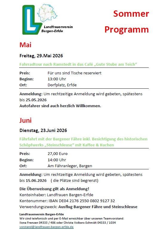 Wir, die "LandFrauen Bargen-Erfde", setzen uns für die Belange von Frauen in ländlichen Gebieten ein. Durch unsere Veranstaltungen und Projekte stärken wir das Netzwerk und die Stimme der Frauen in der Region. Über die Jahre haben wir viele Initiativen ins Leben gerufen und sind stolz auf unsere Gemeinschaft.